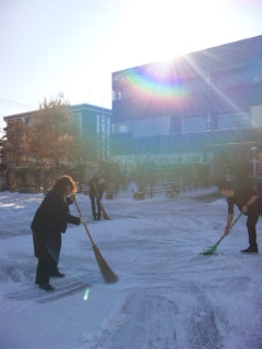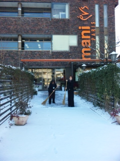 マニパリの駐車場もお庭も雪が積もり、朝からスタッフで雪掻きならぬ、箒での雪掃き??をしました!!